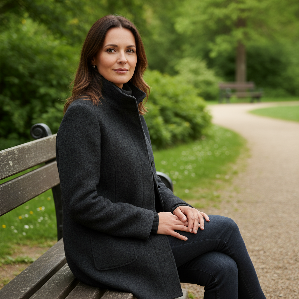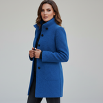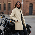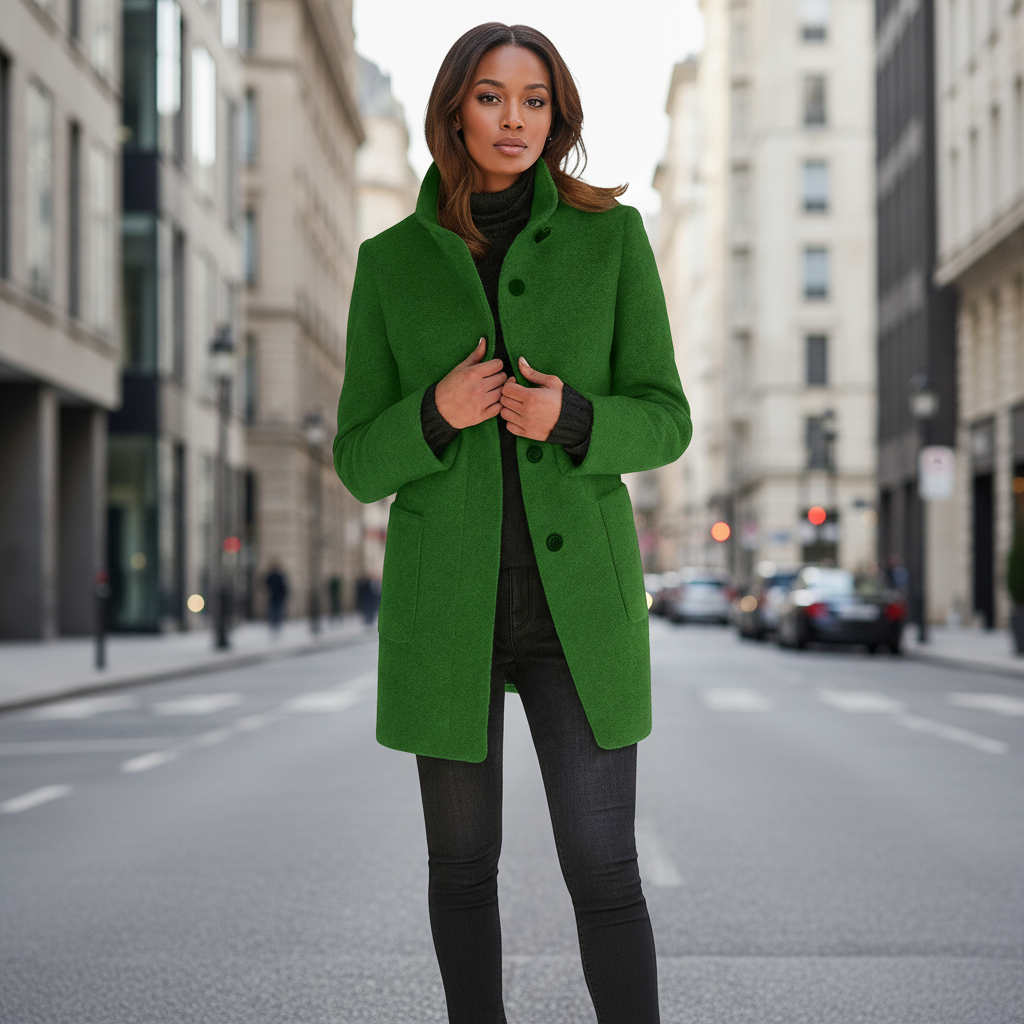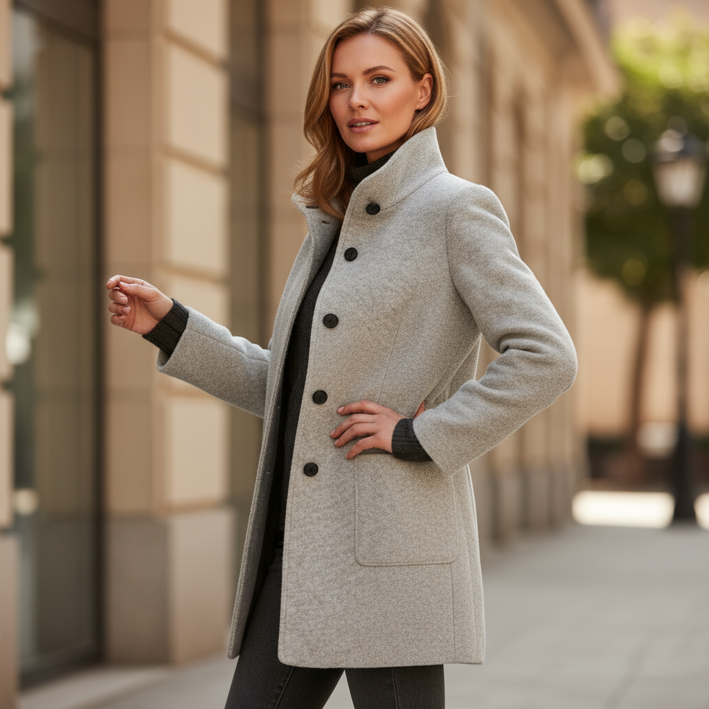 Takki niille, jotka etsivät lämpöä, tyyliä ja itsevarmuutta kylminä päivinä. Suora ja siro leikkaus korostaa siluettia hienostuneella tavalla, ja korkea, korealainen kaulus suojaa tuulelta tinkimättä elegantista ja modernista estetiikasta.