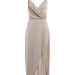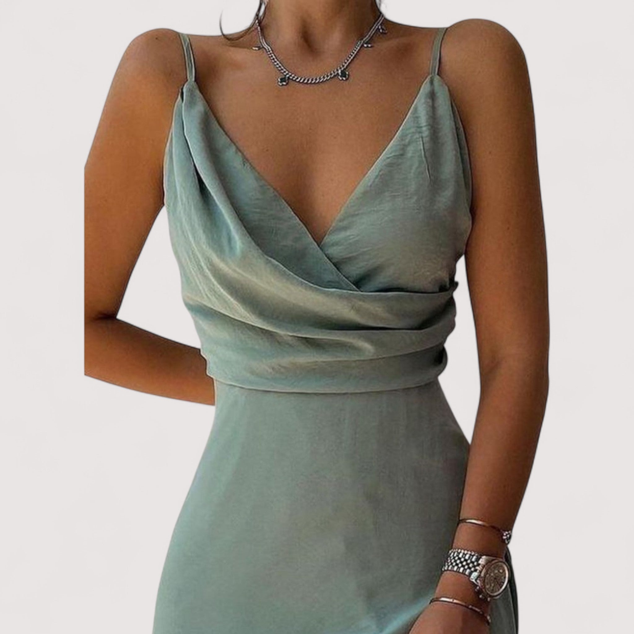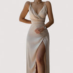Olipa kyseessä kesähäät, kattoterassijuhlat tai romanttinen illallinen – tämän mekon kanssa olet aina täydellisesti pukeutunut. Pehmeä kiilto ja virtaava leikkaus luovat naisellisen, vaivattoman ilmeen. Korkea halkio lisää ripauksen draamaa ja eleganssia.