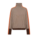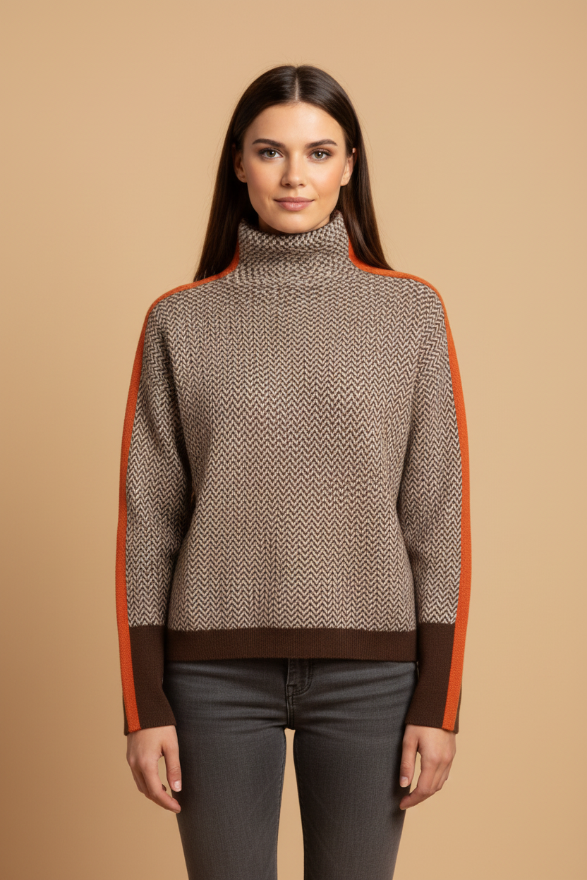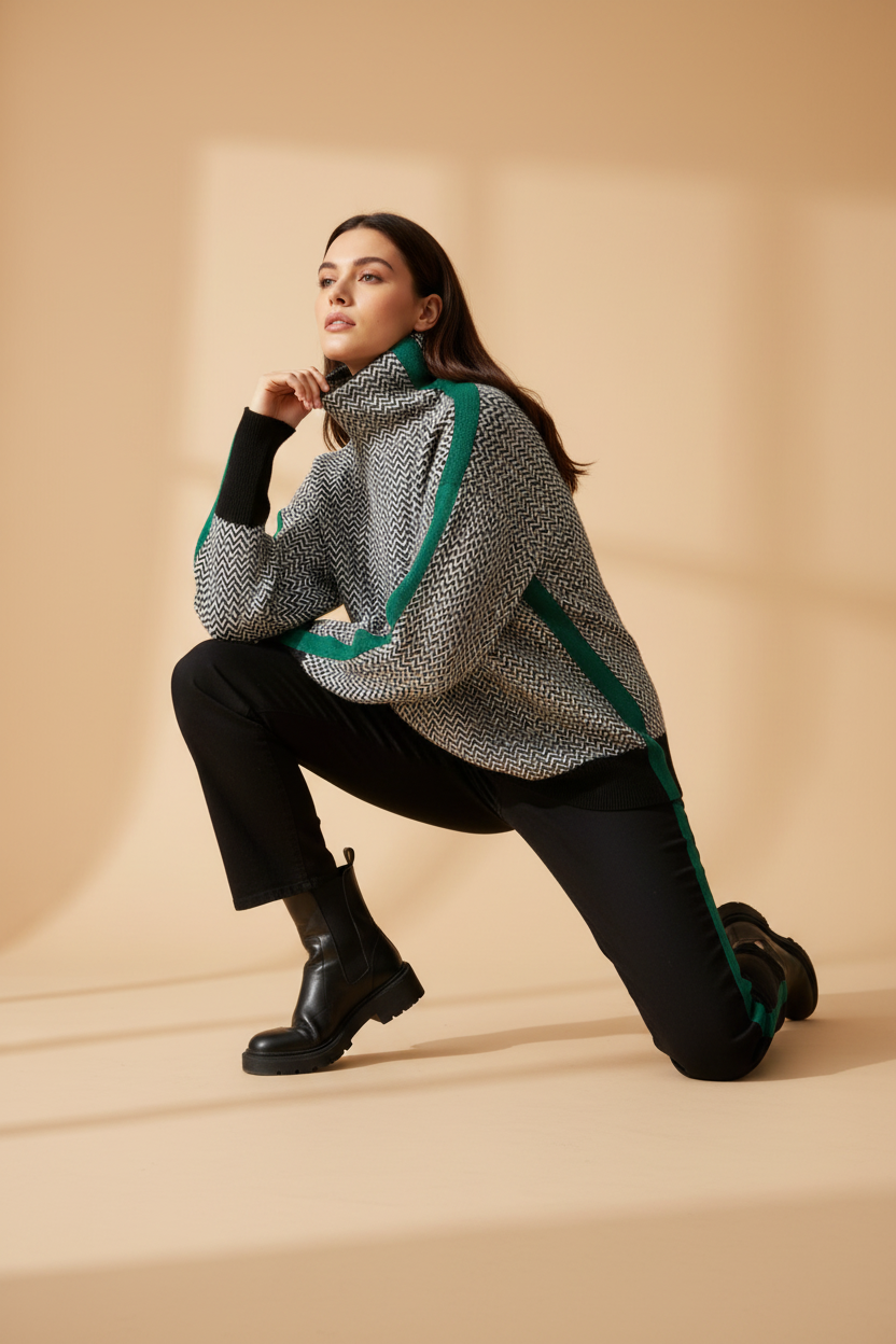 Design: Korkea poolokaulus, pitkät hihat, kuvioitu pinta ja kontrastihihnat sivuilla.