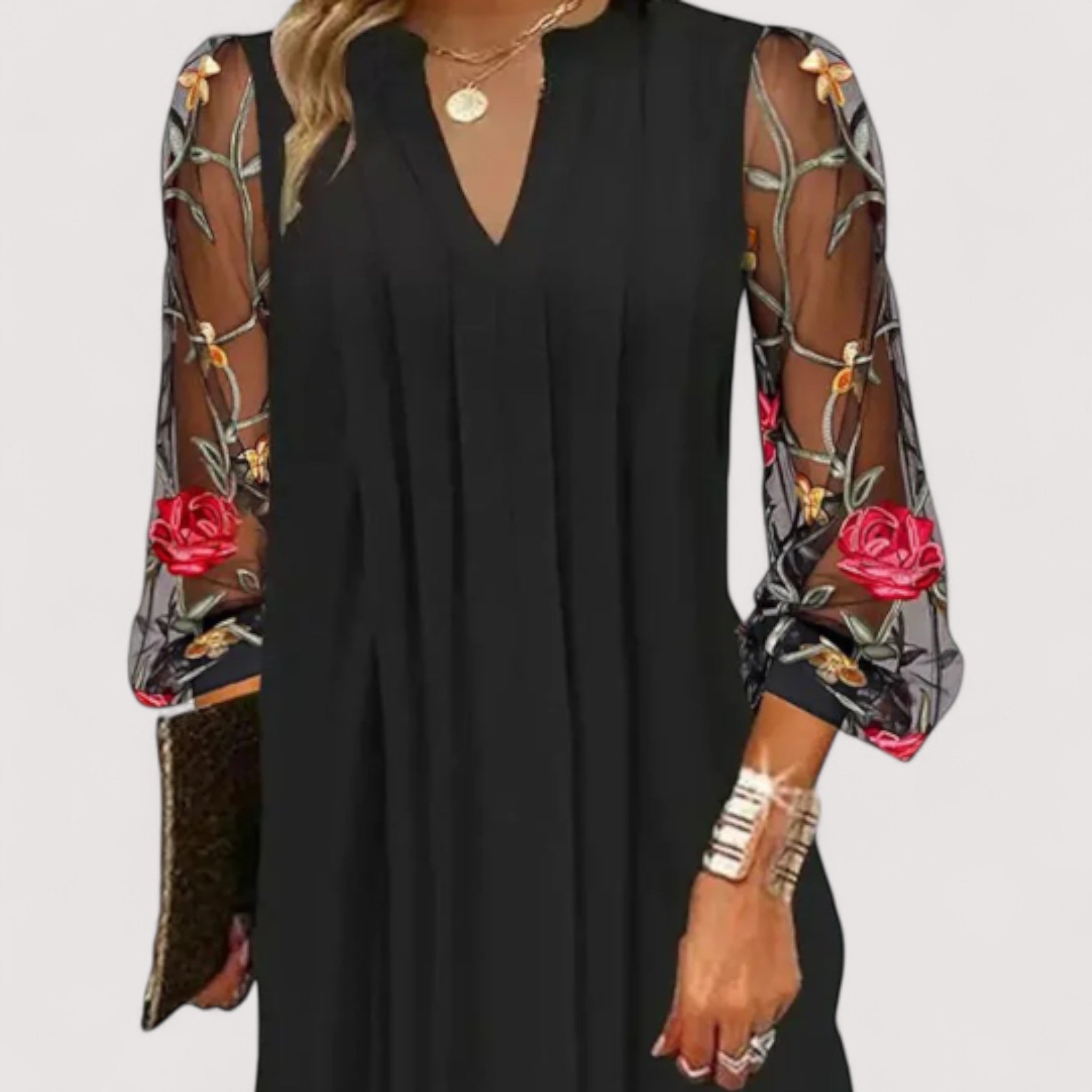 Tämä mekko on hienovarainen katseenvangitsija. Syvä V-pääntie ja läpinäkyvät hihat antavat sille hienostuneen, naisellisen ilmeen.